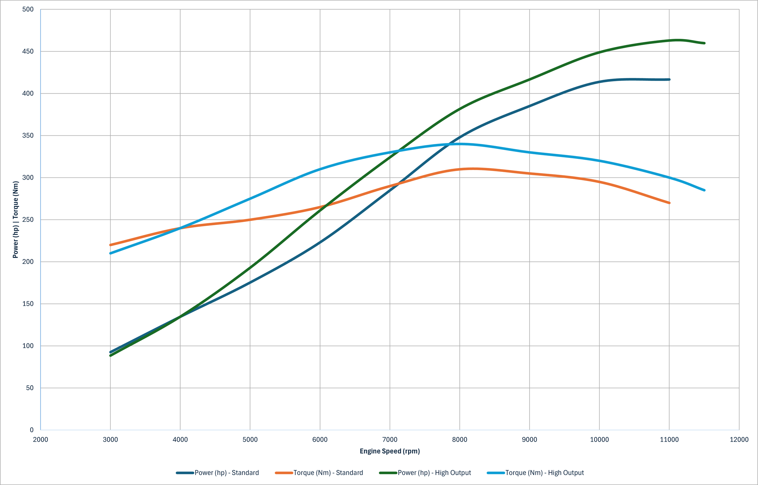 Broad torque curve delivers superior throttle response. Over 300Nm from 6,000-11,000rpm.